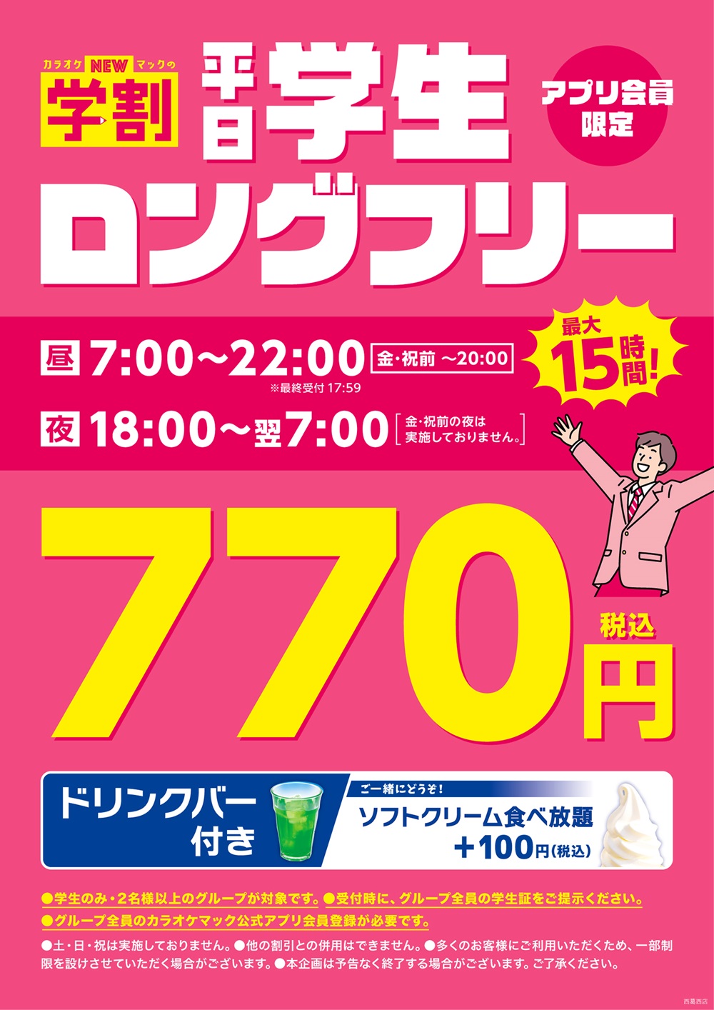 | アプリ 会員学生グループ限定 ロングフリータイム 7:00~22:00 ※2名様より受付 |