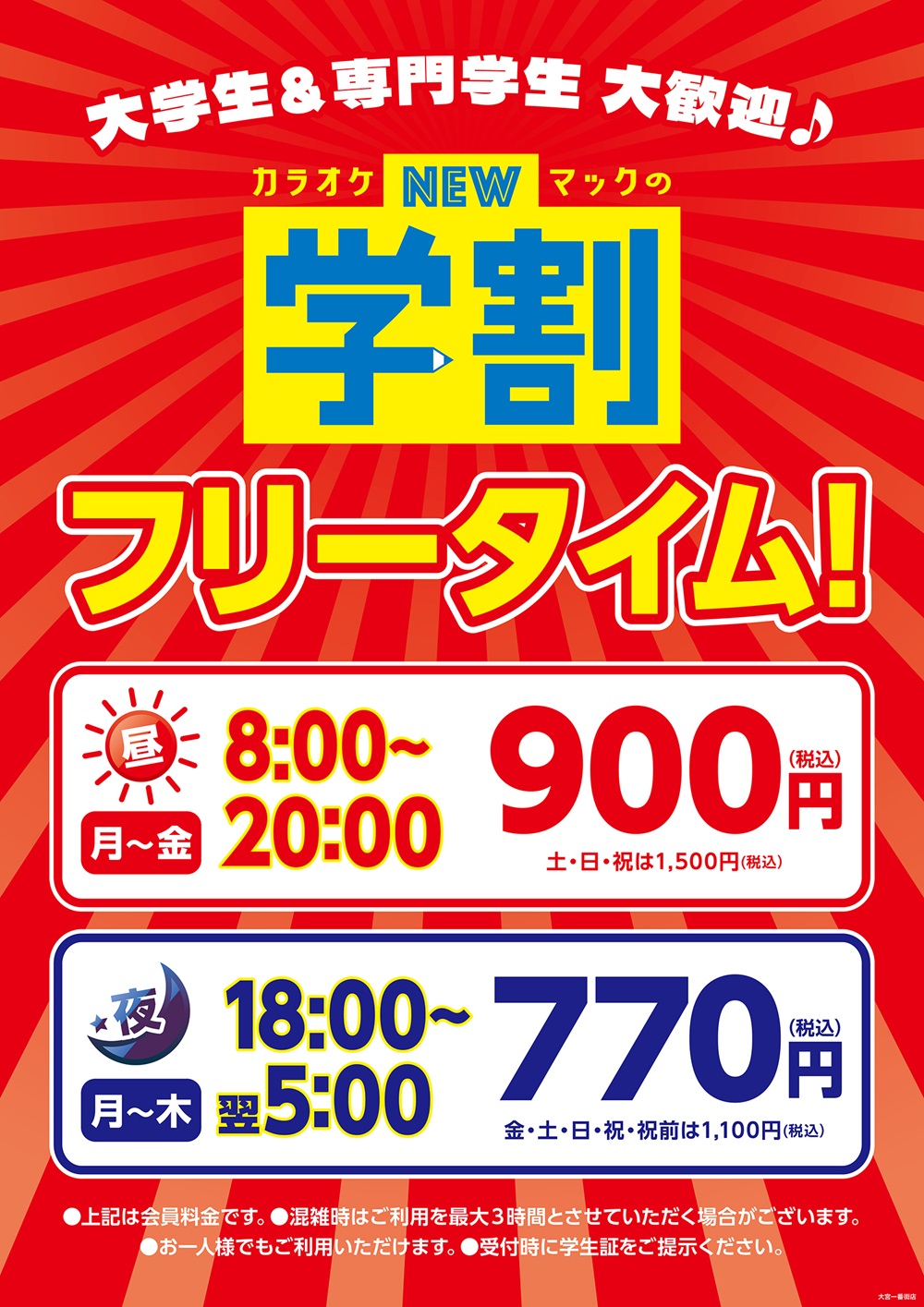 | 学生グループ限定 フリータイム 18:00~翌5:00 |